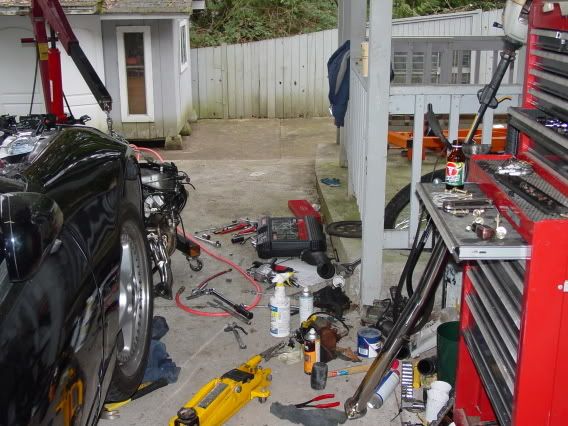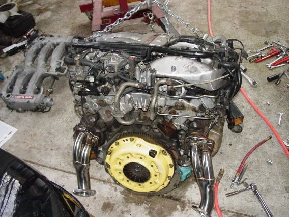 I pulled the little bit of my engine and decided to get a used jdm motor. There it is... reinstalled ACT clutch, downpipes, and did a bunch of little us spec conversions, mainly the vacuum hook ups. The VST? wires frayed off so i had to redo and solder them back on... pain in the butt... just finished engine prep... process of setting motor in... Waiting on new motor mounts, driver side broke off while i was pulling the motor---stupid me... : What a MESS!!! I hope this all pays off in the end...I miss driving her...