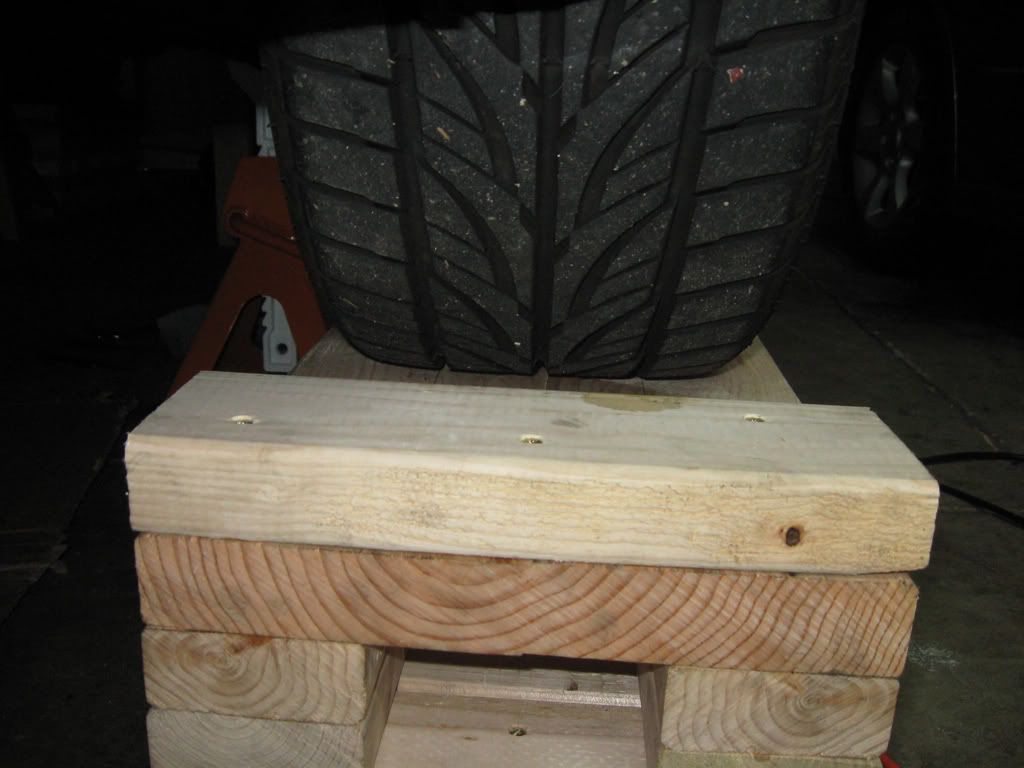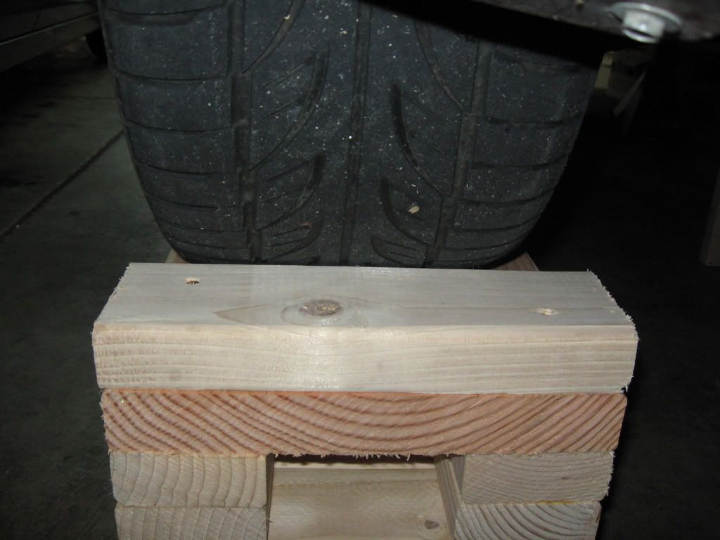 | I originally bought 2x10's to construct my blocks with but ended up going back to Home Depot for some 2x12's thanks to these guys. I am very glad I did. As you can see even with stock wheels and tires the 2x12's are not much wider. My tire pressure is a bit low on the rear though.