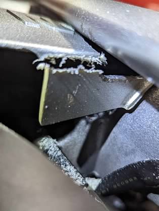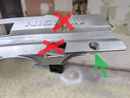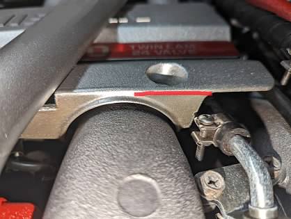 The throttle cover remains structurally sound with all the cuts shown. When sliding the cover in and out I put a thin rag between the bar and the cover to help prevent scratches. I smoothed the cuts with a file for better cosmetic appearance. Note that that the cuts on top of the throttle cover under the red X's were already there to make room for the bar itself. My smaller cuts on the side are what enables the cover to slide in and out.  Driver side after cutting and filing smooth.