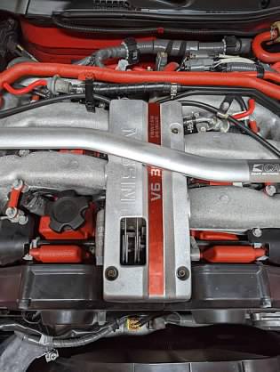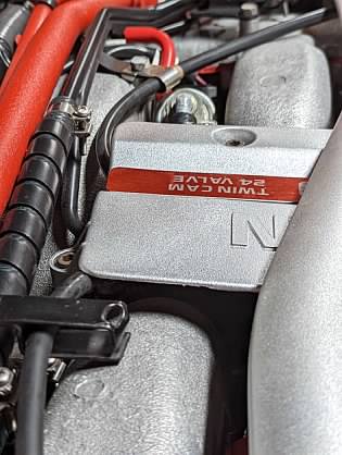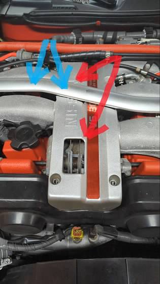 If you have a front strut bar, this shows a couple of barely noticeable cuts you can make to your throttle body cover that will allow you to slide the cover in and out without having to remove the front strut bar. I have a Carbing front strut bar. Without this simple little mod, the strut bar must come off first in order to remove the throttle body cover.  Blue arrows strut bar, red arrows throttle body cover Doing this mod takes less time than removing and replacing the front Carbing strut bar one time, so you save time the very first time you do this, and even more time in the future, every time you remove the throttle body cover. Win-win. Reasons for removing the throttle cover while leaving the strut bar in place include but are not limited to, working on the cruise control, adjusting the throttle cable, replacing the fuel damper or fuel pressure regulator, Dremeling out a fuel injector, and perhaps the most common reason, tightening fuel line clamps which is basically an annual ritual on these cars.