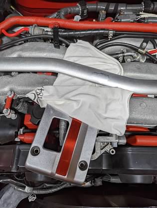 Removing and replacing a front Carbing strut bar is not as easy as it looks. You have to jack the car and remove just the right amount of sprung weight on the suspension to take the tension off the bar, while making sure the strut studs don’t fall back into the wheel well. After this mod, you don’t have to touch the strut bar to remove the throttle cover. You simply cut off two small side pieces of plastic at the back of the throttle cover that are curved around the intake plenum runners #5 and #6. After that, it is possible to wiggle out the throttle cover from the front without removing tha strut bar.