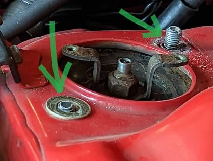 Jeje je je, je he said "jacking position," still channeling Beavis. I've been watching a Beavis & Butthead marathon on Prime Video all day. The arrows show the mounting studs for one side of the front strut bar, with the car jacked in just the right position, not too high, not too low. Notice how the strut stud closest to the camera is almost flush to the surface. This position is necessary to take the tension off the strut bar when installing or removing it. This can be a little tricky since if I jack the car too high, the stud disappears into the wheel well. This is also why my little hack saves so much time, since it circumvents this step. No more jacking or removing the strut bar just to take off the throttle cover. Clear as mud?