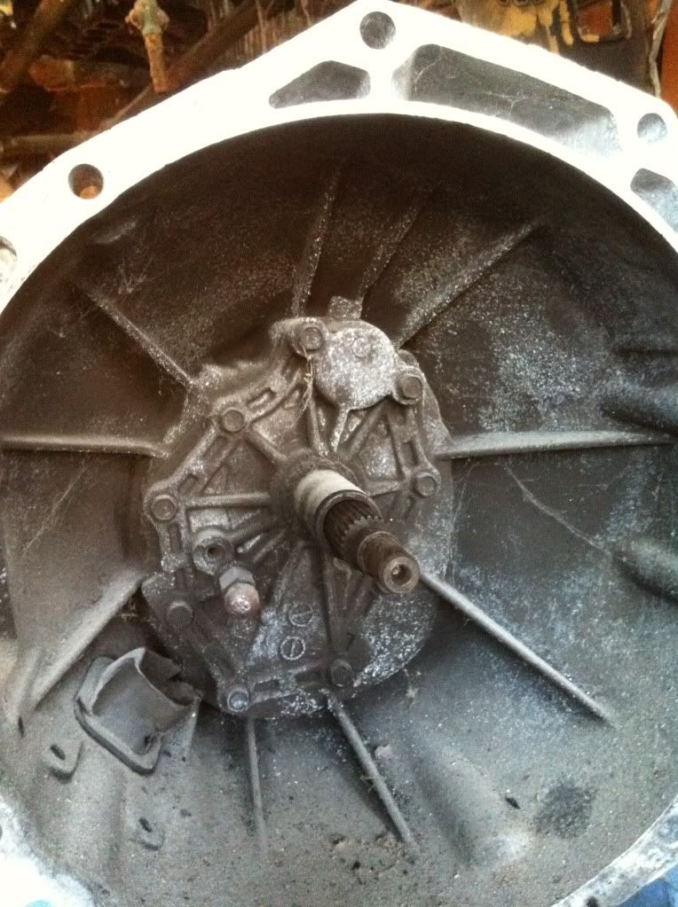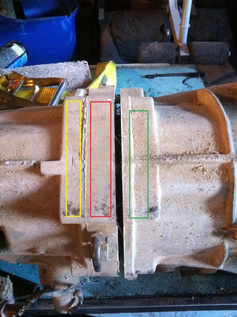Then remove the 12 14mm bolts holding the bell housing to the adapter plate, and rear extension. Rear extension yellow, adapter plate red, bell housing green
