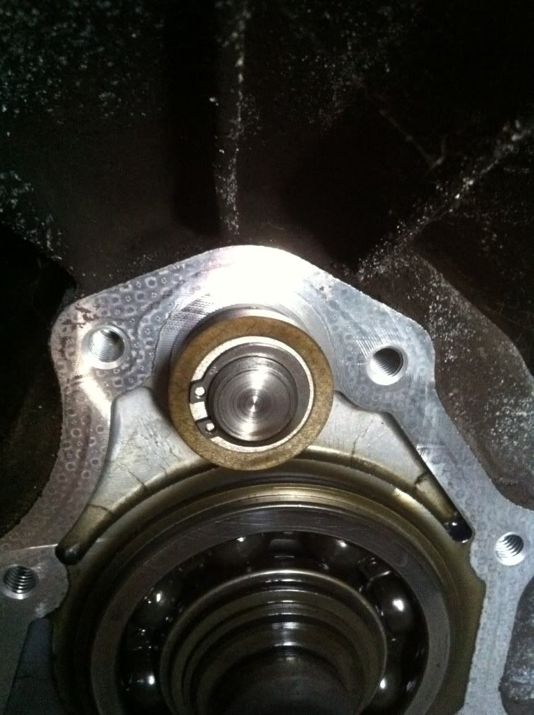 Here's the part that people don't like to fool with. If your not used to dealing with snap rings the can be a pita. Remove the stopper snap ring and ring and the main drive bearing snap ring. Stopper snap ring and ring