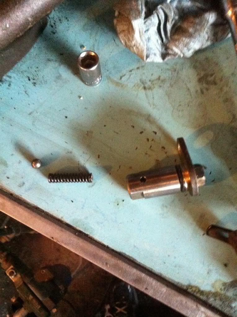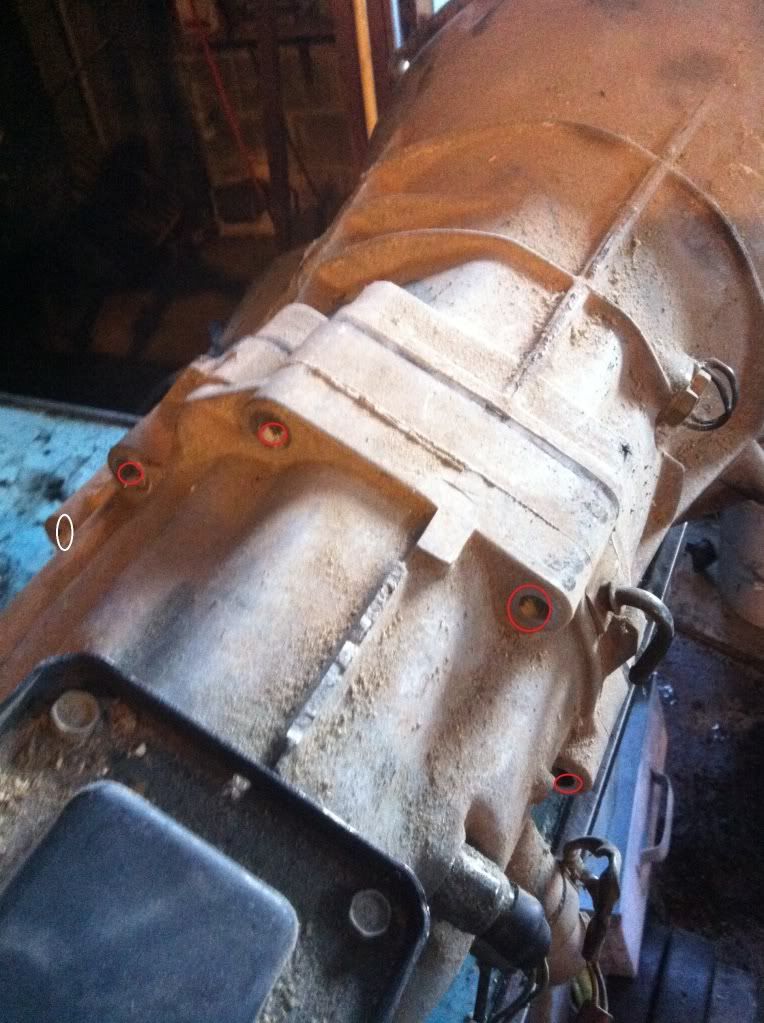 Tools needed. Snap ring pliers A socket set Small beveled chisle Dead blow hammer Cleaner of your choice Flat head screw driver Start with the transmission your not going to be using to get familiar with everything. I"m only posting pics of the separation of the first transmission. To put it back together just reverse the order and make sure you have the snap rings seated good. Start by removing the check ball plug, spring, and check ball. Then remove the interlock stopper. The plug is in red, the stopper is in yellow. If you remove the stopper first the ball will fall into the case and you'll be looking for it later. There are different size ball bearings for different years of transmission. Keep the assembly with the gear box it came from.