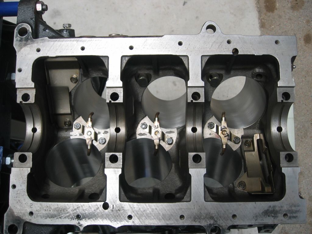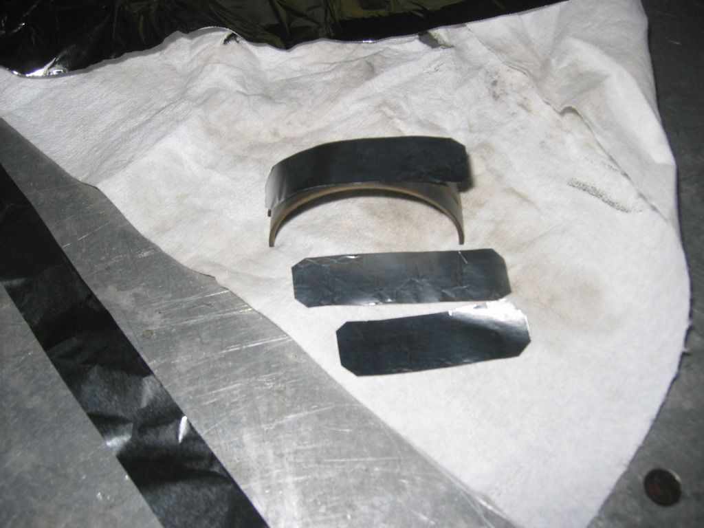And these are the shims sitting on the bearing shell.. these are 'length One' for the Shims.. ( Long ).. IF another shim was to be placed with this shim on the same shell half, it'd be shorter in Length by about 1/4 to 1/3.. Do not want the sides of the bearing to get tight.. No real load is taken there, but the heat generated there will still destroy a bearing.. Lets the Oil 'Pool' at the sides ..