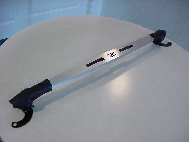 I have received some interest beyond the one unit I sold here recently. I have one buyer who is committed. But in order to make another batch, I have to order a minimum of 4 bars...hence the "group buy". This is not a typical discount-style group buy, but one which depends upon a group to get it off the ground. This rear strut brace was designed by BrysZ and his water-jetter made four bars for me to test the waters for interest. The one in BrysZ's car as well the one in my car are made to custom lengths. I designed these to be adjustable. It is water-cut from 6061 billet aluminum. The finish is brushed with black recesses and clear lacquer finish. However if the prospective buyer wants to polish or polish/chrome, or even powdercoat his, I will send it in 220-grit sanded finish. 2 black leather boots are provided to cover the hardware. A template is also provided to show where to cut your shock tower covers with a 2 1/4" or larger holesaw. This bar is for the NA or TT coupe. I have no access to a 2+2 so although it will fit the 2+2, I have no template for cutting the shock tower covers. Included will be a standard bar for those who show their cars on some weekends and race on others, so that the racer can switch bars and "pre-load" his shock towers prior to racing. The Brysz bar is fully functional, but chunky in cross-section and turning it to pre-load will probably scratch the tower cover plastic. The eye-bolts are left-and-right-hand-threaded for this purpose. The price on this is $180 plus $15 shipping. My target price was 80% of the Carbing, and this price actually comes in at 65%. Email me if you are interested.