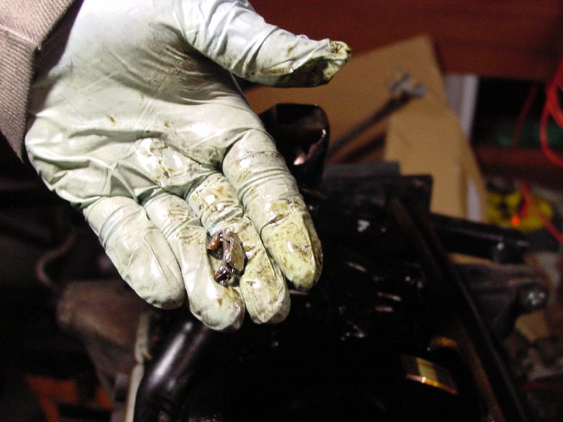 My Z was suffering from low compression in #3, and since I had the heads rebuilt last spring, I knew that it had to be a problem with the bottom end. I thought it might be a cracked ring land, but as you can see below, it wasn't. I popped off the oil pan and found this sitting on the crank (engine was flipped over):