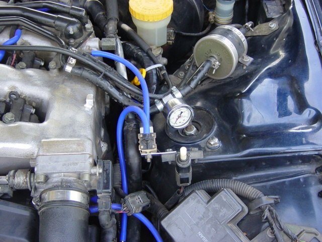 adapter The 3/8" adapter is a little big for our 5/16" fuel lines, but with a little isoproyl alcohol (or WD-40) and some grunting, the lines will go on. Make sure you get some fuel injection hose clamps for 5/16" hose at the auto parts store for where you're going to splice in the adapter (the kind that are a solid band with the captive square nut and the screw). Also, put some teflon pipe tape on the gauge threads before screwing it into the adapter.