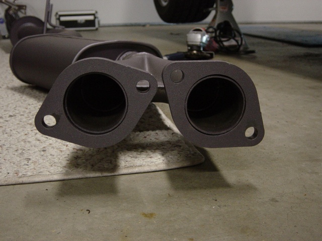 If you're going to join the flows with an X or an H pipe, why separate them again? A single pipe will lose less energy from heat dissipation through pipe walls (which means more energy in the exhaust flow). The single will also weigh less (my N1 weighs 30 pounds from the cats back) and you can shift that weight to the passenger side for slightly better weight distribution. Sure, a single doesn't look as balanced as dual mufflers and a huge angled tip isn't exactly subtle or stock-looking. I'm not a big bling fan plus I'd like to make the exhaust a little more stealth, so I'm going to be painting the tip and can on mine flat black. Anyway, here's some pics of mine during install (save the wheel police tickets for the noobs - I mixed 'em up while doing some work on the brakes and they have since been put on correctly):