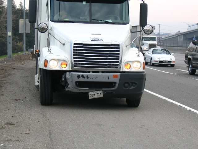 This is the fully loaded big rig that plowed into the chick in the Taurus because she decided to stop in the middle of the freeway: You can see that the impact was so bad, that it ripped off part of the steel bumper on the passenger side of the big rig. That and the picture of the Taurus is scary indeed.