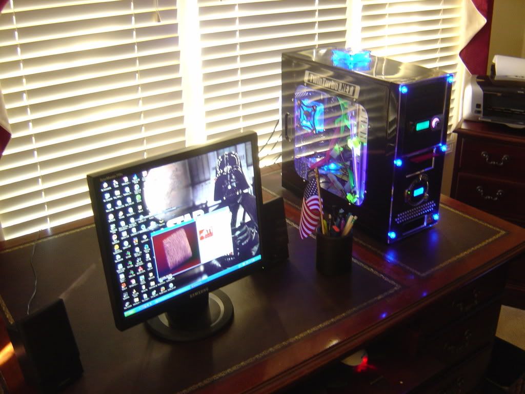 just got done finishing up my computer...gosh i'm such a dork but i promised myself i wouldn't put any stickers on the Z..so i put it on the next best thing, my machine. it's watercooled and overclocked hehe. but yeah showin my support for the best forum on the net!