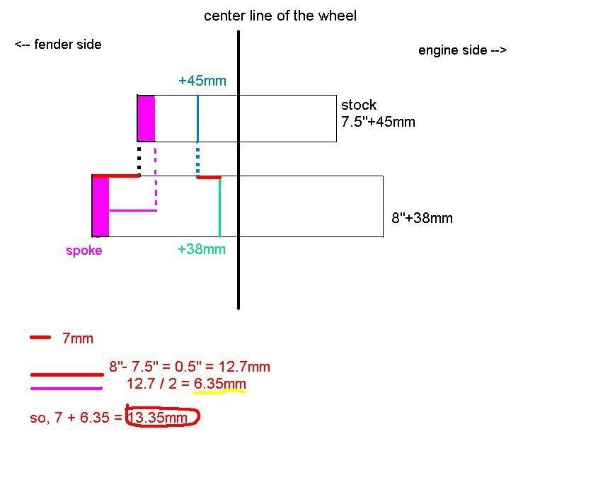 Depends on the spoke design. Assuming this spoke is flat like the stock, stock front is 16x7.5"+45mm and the new front is 18x8"+38mm:1) 38 - 45 = |-7| = 7mm, the new wheel sticks out 8mm more, which in terms you have 8mm more clearance. 2) 8"- 7.5" = 0.5" = 12.7mm 12.7 / 2 = 6.35mm, The new wheel is 6.35mm wider on inner and outter side. 3) 7 + 6.35 = 13.35mm The new wheel has 13.35mm more clearance and sits 13.35mm furthur out. Simple?