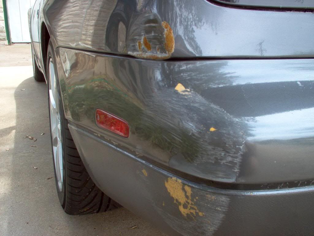 Well, someone decided to back into my car a couple nights ago, seemingly a big truck or suv with a grill guard... I found it after coming out of the movie store... Shit happened withing 10 mintues. Came out, seen the damage. No note, no nothing. Asked around, nobody saw/ heard anything. Video store doesn't have their surveilance cams turned on outside during store hours FIGURES. So my question is this, the damage is to the rear drivers fender. It's about the size of what a fist would make it you could punch the car hard enough to get it to dent in... This part of the fender is metal. BUT the rear fender goes all the way from under the driver's door, around to the rear drivers quarter panel, around the rear bumper, the passenger quarter panel, and down under the passenger door... Is this all 1 piece? What's the best way to get it fixed? Crappy bondo job? Or is it feasbale to purchase the whole damn part and have it painted? Thanks for the help.