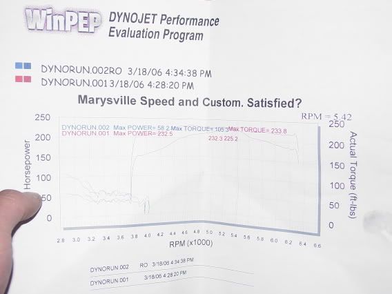 | Today I had the chance to dyno my fresh jdm motor and a bunch of other goodies with ZCCW @ Marysville Speen N' customs...But i ran a little late and missed everyone... I decided to Dyno anyway, I was expecting great numbers but she wont give up. More problems... The only things that turned out good were pics, lol. The dyno said I was running really lean over 12:1? Guy said i was running over 12, dangerously lean, and said i should be running under 12... I'm not sure what the heck all this means. Air? Fuel? Ratio? %? All I really know is that i didnt have enough fuel running in... On stock boost I put out 232... :( I believe the problem lies within the injectors. Im thinking that the connectors are corroded or i just need new injectors. These are the stock injectors from the jdm motor. or The motor I got is an automatic motor and the motor i had in there before was a manual. Are there major differences between the two motors? Im running a JWT ECU set for a manual, is it compatible with this new automatic motor? Could that be the problem??? Any ideas?