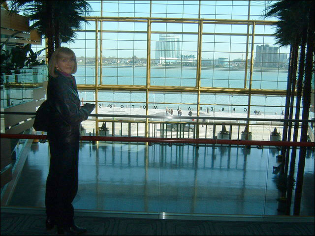 My mom, standing at a glass rail inside the GM building. This is the rear of the building, looking out across the Detroit River at Windsor, Ontario, right at the big casino over there: