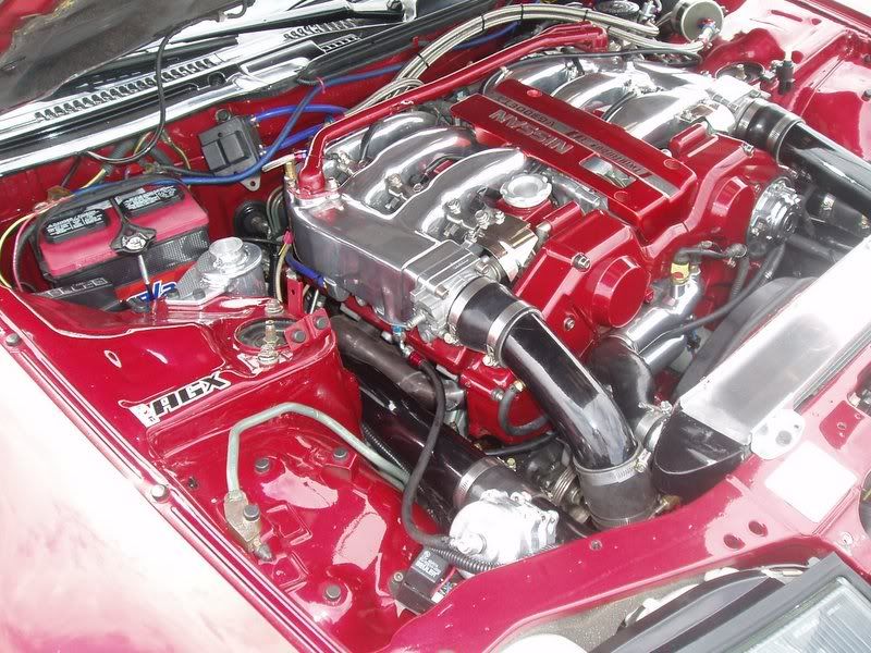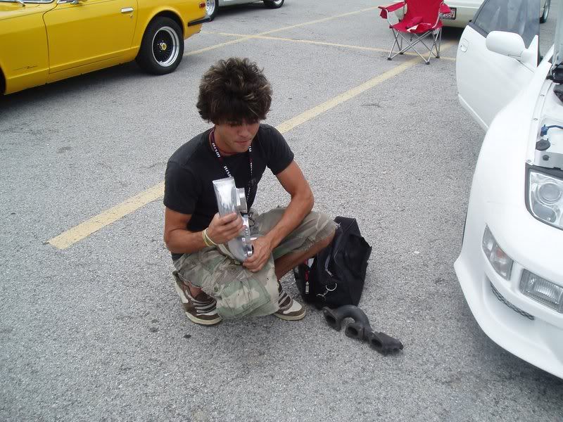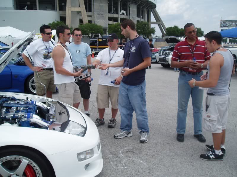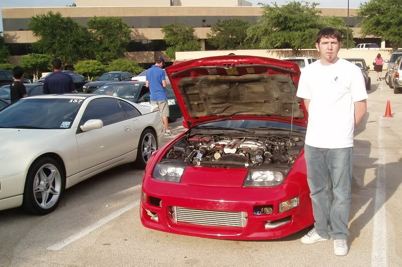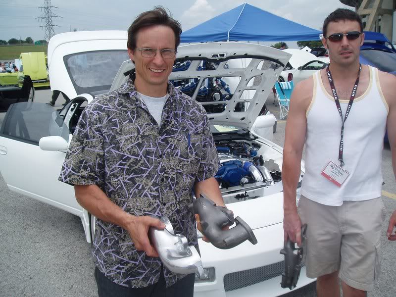 | in "first" major Z event. No longer "noob", it was fun to hang out with some hard-core tt.net "veterans" and actually feel like I was part of the club. Sorry this is so late; my pics got skruud up on 6-6-06. Tho in Dallas for just 27 hours, I saw more Z's than I've ever seen in my long lifetime and met more people with more screen names and faces than I could remember. One of the first to welcome me was Dee Rigeway (DevilsZ), a fantastic guy with a great car. Next was Shawn (sfarrah), who volunteered his newly-scored MS maniafolds for some pics in front of Woody's fine white, mirrored underhood TT. I have to admit that the manifolds looked good, better than I envisioned. Of course my AAE pipes will blow them away (lol), but his tooling and machine work is very fine. Despite the similarity, port #2 and the d/s collector are a dramatic improvement over the stock TT manifolds. I'm sure when Mike sees these pictures he'll reposses Shawn's pipes, but I really enjoyed our cordial conversation. Just then Nicholas (Nixit) drove up in his "Skyline" and Bernie (YogoBernie), also a great guy, made sure I was introduced to him. Sure Nix has beated the living crap out of me (or tried), but none of that was present at our face to face meeting, just as if we were old friends