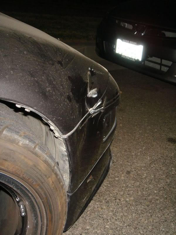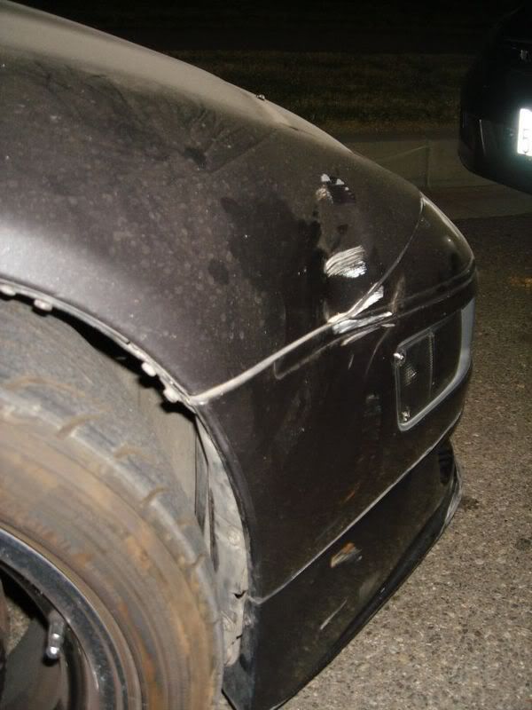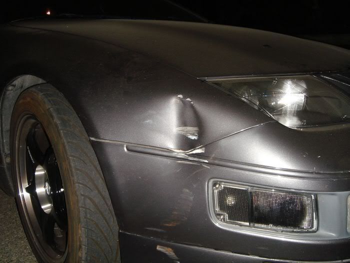 Message So I get to work at about noonish, Park my car in my normal spot as always. Get into work and find out I'm supposed to be at the other shop that we're putting together. So I was going to jump in the Z and drive over to 1000 Oaks to the other shop, as I’m about to get into the Z my cousin whom I work with comes out and asks me if I want to catch a ride with him over to the other shop and to just leave the Z at work. so I decide I would go along with him (Forgetting that I was supposed to go home to pick up my ASH intercoolers that were supposed to arrive later in the day) so I arrived at the other shop at about 1pm at about 1:30pm the little light in my head turns on to remind me I have to pick up I’m IC'S. So I jet home quickly in the "Van" to find the mail man turning on to the main road away from my house. Then when I arrived at my house no box mail man left me the little pink slip apparently my not to leave the package ended up blowing on to the lawn and not being seen by the mail man. At this point I’m upset I drove almost 25 min's for nothing, so I turned back around and went back to work and at about 6 we left the other shop and return to our regular shop where I find my Z is parked and in perfect condition as I left it. My uncle who is also my boss and one of our employs decide to stay on the dock and have a smoke. so mind you iv been in the shop for maybe 5 min after about 4 hours of ass breaking labor and all of a sudden my uncle who is of Thai ethnicity comes in with his funny accent and his hand covering his head and says to me "Juan did u see what they did to ur car?" at first I though he was joking with me like he dose all the time then all of a sudden our other employ comes in a says” did u tell him?" to my uncle once again I though it was one of there little jokes. Well turns out in the time it took me to walk in from the dock and help a customer one of the guys from the shop next door backed his forklift into my front passenger fender and bumper and lip. So needless to say I was quite upset and was giving the rest of the day off with pay. But F$%K man id rather have worked all day and not gotten paid than to deal with this. All of this after my excited post last week with all my parts and infamous box shots. Well I guess all fun must come to an end, and man did that slap the smile off of my face.
