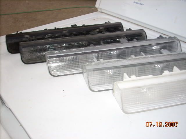 Some pictures of the 3rd brake lenses in 5 different shades. But only 3 will be offered the clear one to match the superwhite z's the clear ones to match the 99jspec tails and smoked.Still experimenting with the LED setup