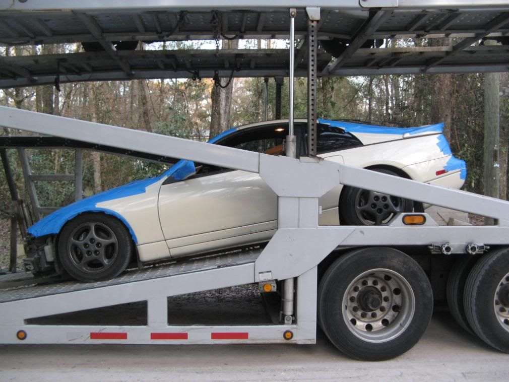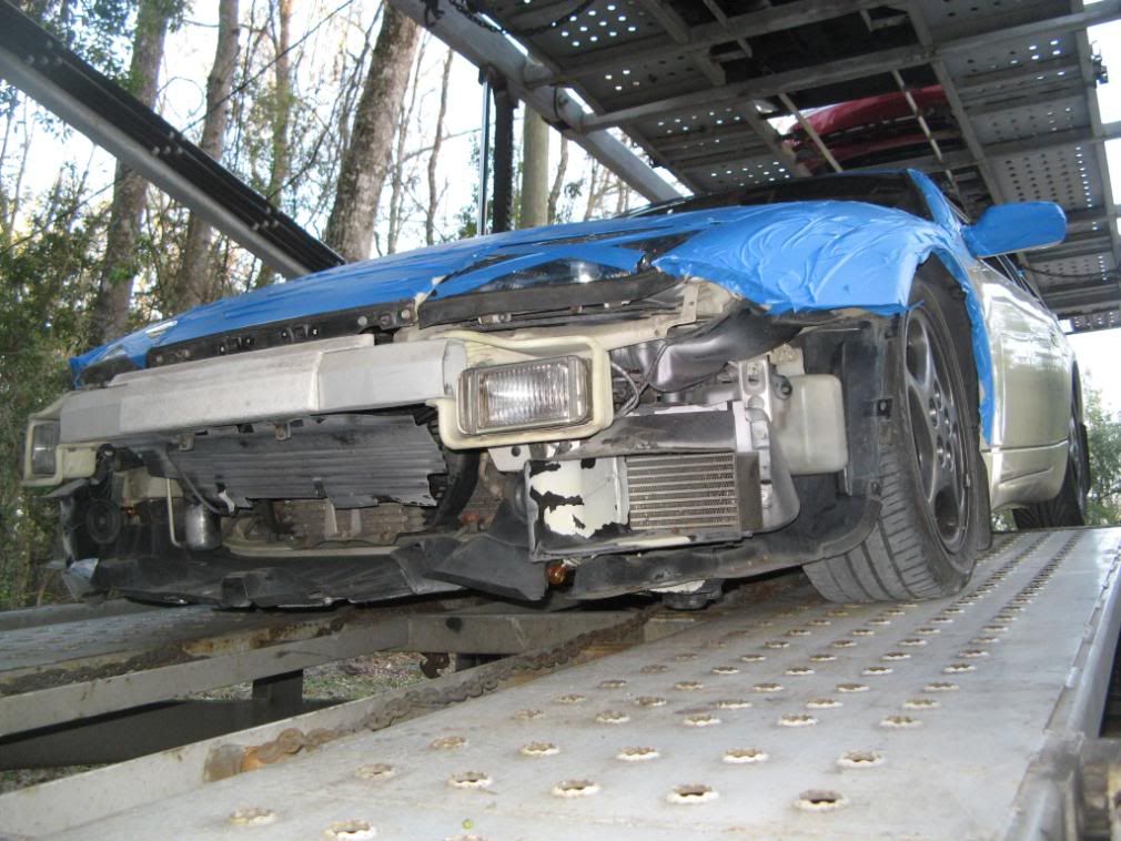 It's a good thing I DID take off the fascia. I was already on pins and needles watching him drive it onto the truck (scraping the bottom as it went over the curve). Imagine how I felt when he forgot how to use the brake pedal and I saw my Z slide down the ramp face first into a ball hitch of the truck ahead of me!!! I'm so glad the fascia was removed for that. Luckily, it didn't really do any real damage. It just cracked the foam a small amount. On top of all of that, he failed to move the hooks/chains out of the way and and the Z got snagged. Instead of stopping, he just revved it harder and harder and wondered why he wasn't going anywhere!