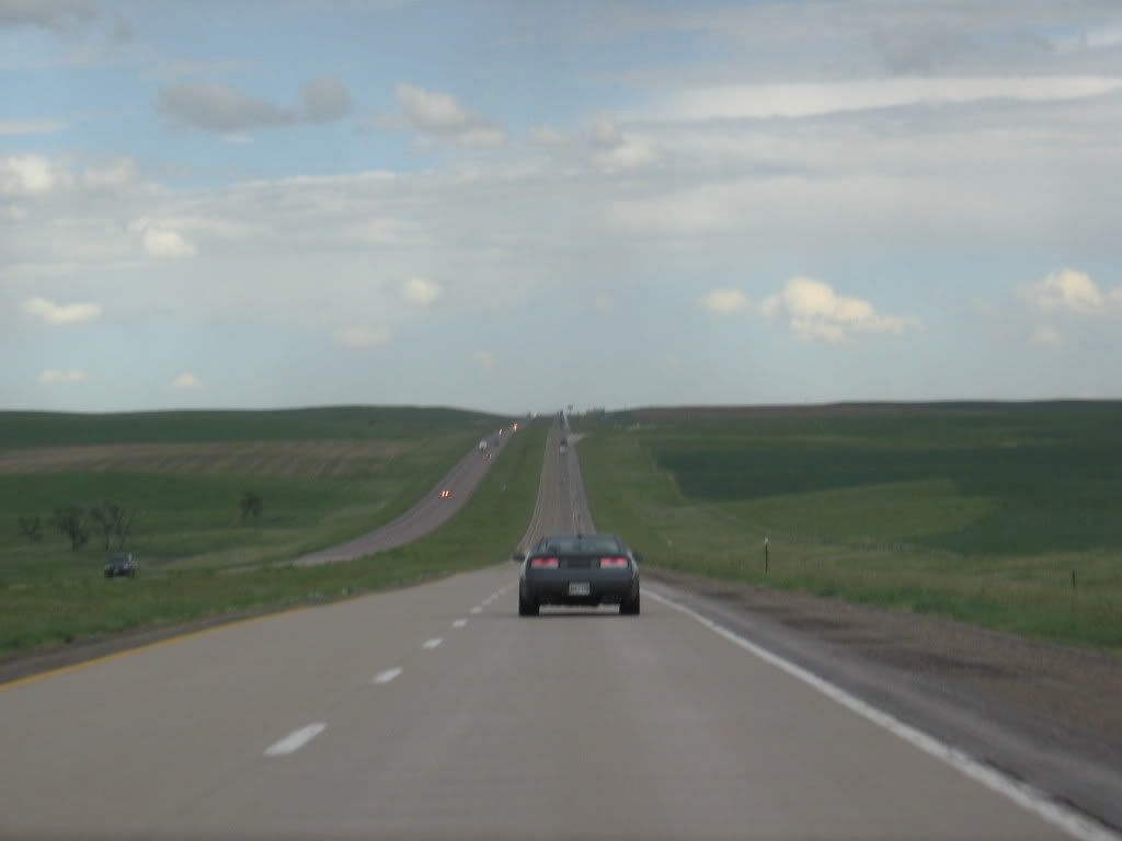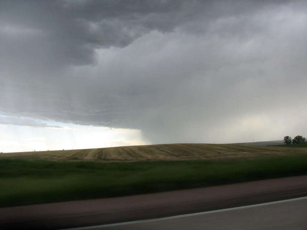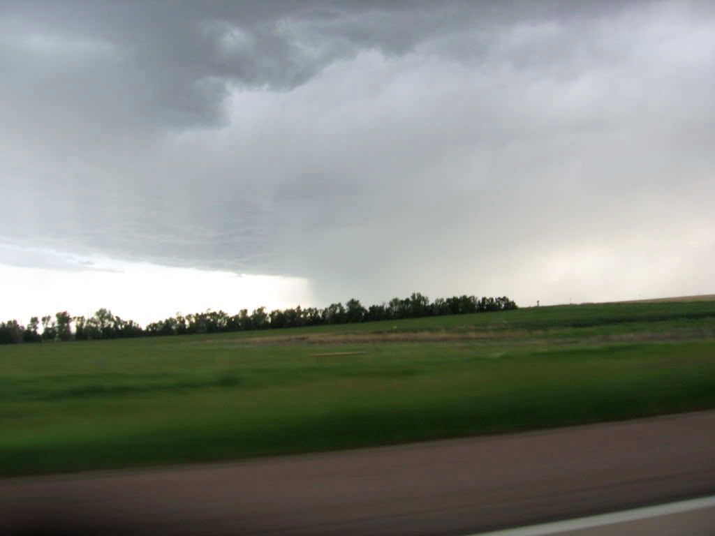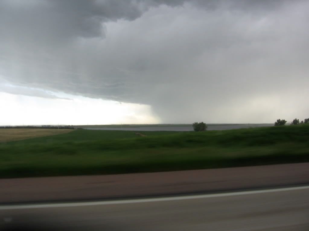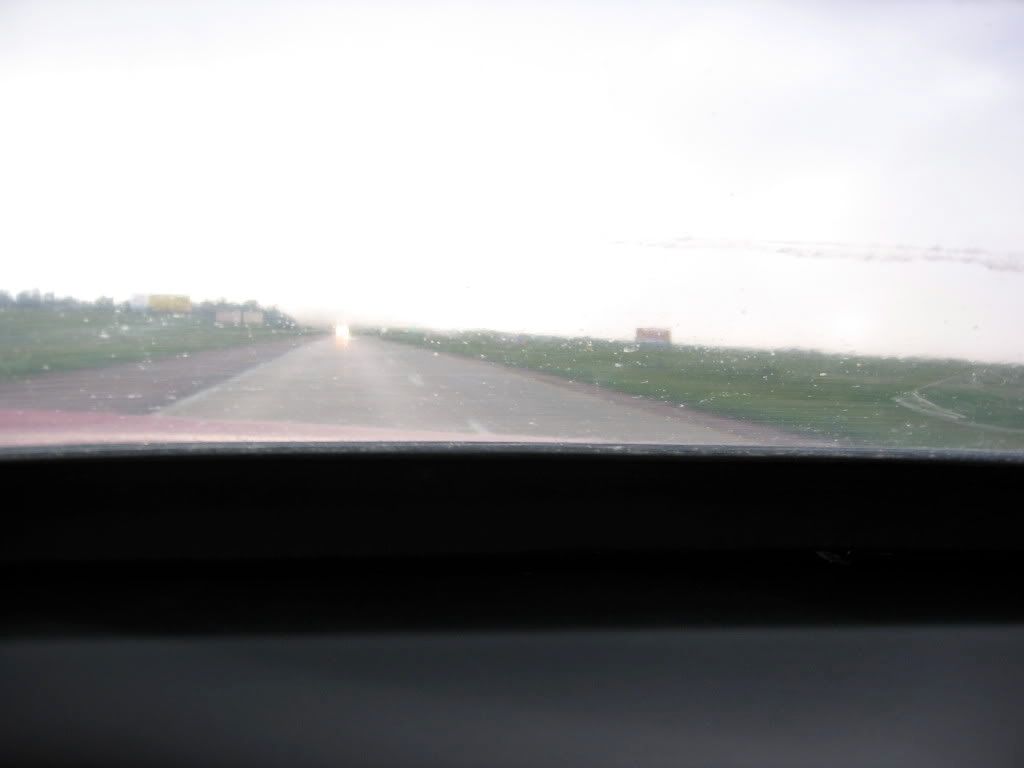 | Led a small convoy of Z32s across country to Reno. It rained the first 2 days of the roadtrip. One of the co-drivers was a 240Z guy and had never driven a Z32 before, so of course there was concern about him driving one in the rain. I told him to drive with his fingers instead of his arms and the Z will behave just fine in wet weather. On the way back home, the 240z guy was at the wheel of a red vert when a ferocious storm blew in through eastern South Dakota. Suddenly this dark cloud set down on top of us and sucked all the hay, chicken feathers, tumbleweeds,...etc off the ground on both sides of the interstate. It got crazy. I remeber the vert falling behind and me yelling on the CB telling him to floor it. According to my GPS, I hit 149.9 mph on my way out of this storm. The owner of the red vert was riding shotgun in his own car and took these pics. It looks like one of those nuclear bomb blasts from the pictures. Pictures cannot portray the power of this storm. Theres nowhere to go, nowhere to hide. Quite a number of cars were blown off the road, but we did just fine. My biggest concern at speed was the debris whipping around like mad. We were blasted by rain. All 3 Zs made it out without incident.