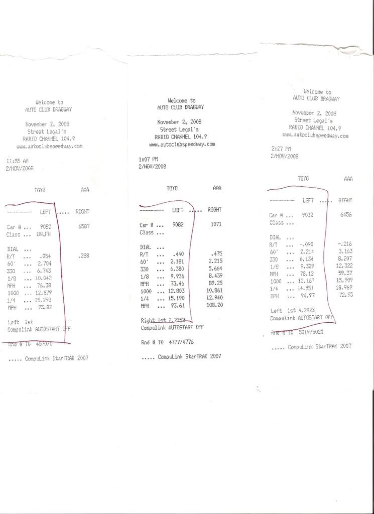 in Fontana. When LACR was still around, I would get faster times and that's at a higher elevation with only 14 lbs of boost. I could get into the 12s and now that I'm trying out Fontana, at a lower elevation and able to run more boost, I suck. Part of it is getting into third gear. I kept grinding it in and on my first run, I bogged it in first. This time I didn't advance the timing from the CAS and left it at 16 degrees. Do you think that would make a difference? Anyway, I'm on the left on all slips.