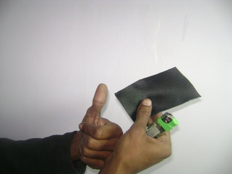 Hello folks, I was thinking about posting something about PVC and real leather for sometime on tt.net. So, here I am. What is PVC and how can you tell?…….. PVC is part leather and part plastic lamination…….bottom line, not real or genuine leather, hence cost far more less then genuine leather. Why is it part leather and part lamination? This is because the lower portion of it is made with the left over of leather hide (the actual hide is about an inch thick, in a tannery it gets processed and go through the shavers to get the desired thickness, the rest is left over). Now, manufacturers don’t just throw the left over in the garbage, they use it and put PVC lamination on top of it. The result is leather look a like product called PVC. I hope you understand what I just said. Now, how can you tell if the stuff that you have bought is made with real leather or PVC, because if you look at it, it looks very even and excellent quality, even an upholstery shop sometime couldn’t tell the difference. I went to many tanneries and they all said that the easiest way to tell is to expose it to fire. Off course you don’t need to expose the whole seat skin to fire, just cut an inch or 2 and then use a cigarette lighter, use your thumb to rub the surface, if the material comes off its PVC (because it’s a lamination), if it doesn’t then its real skin!!! I hope this would not get anyone offended, and yes, please do the test when you purchase a leather product and post the results. Thanks for your time! See the pics, this is not me btw, someone who did the test for me..... Guy showing cigarette lighter to PVC