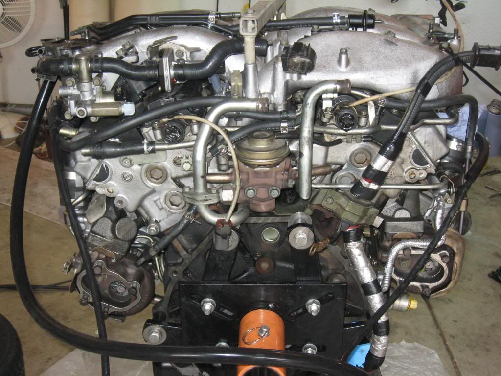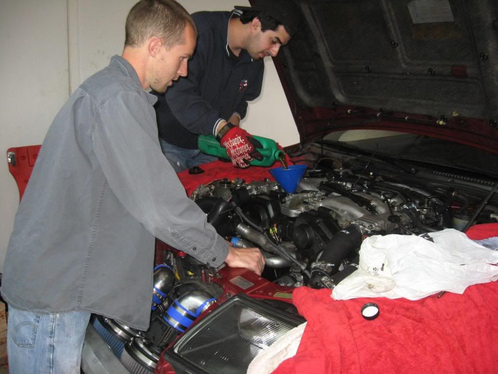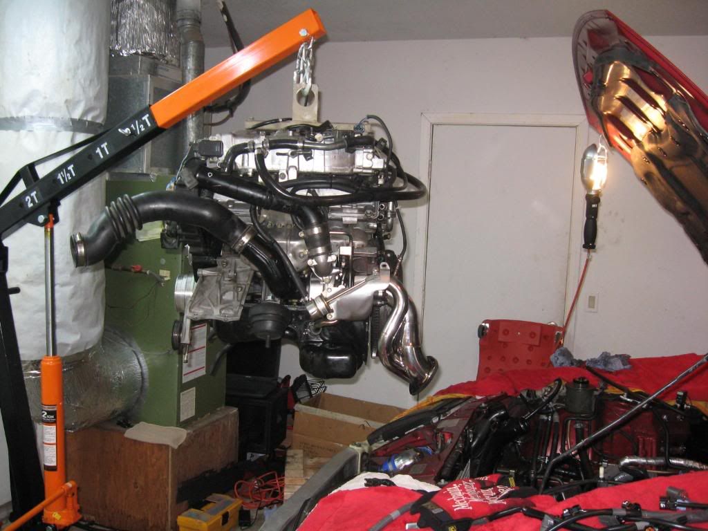 | I recently pulled the engine to do a little bit of this and that. Here are a couple of pictures from the project. And from my profile, this is what was done: -Plenum bypass's. -740cc DW injectors and adaptors -Edge racing Dual intake piping -JWT filters x2 -Dual maf -UR pulley -AMS mani's -SZ 3" dp's -SZ 3"-2.5" TP's -SZ 2.5" resonated x-pipe and single tip oval mufflers -Z1 intake hoses Electronics: -Ztuner ECU -Greddy profec b spec II EBC -Apexi Neo -Zeitronix wideband with optional boost sensor and multi gauge Maintenance: -120k kit -Turbo Gasket kit -New fuel, vacuum, water lines throughout -Clutch master and slave cylinder -New chra's -'95 EFI harness -Ford motor mounts -Nismo transmission mount Cooling: -HI pulley -Mishimoto Radiator Clutch: -CZP SS clutch line -CZP chromoly pivot ball -DXD Stage 5 FE clutch -RPS flywheel Suspension: -ES steering rack bushings -Powertrix SS coilovers -300 degree camber kit Dirty: