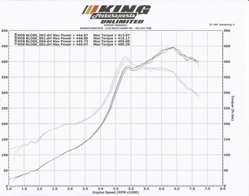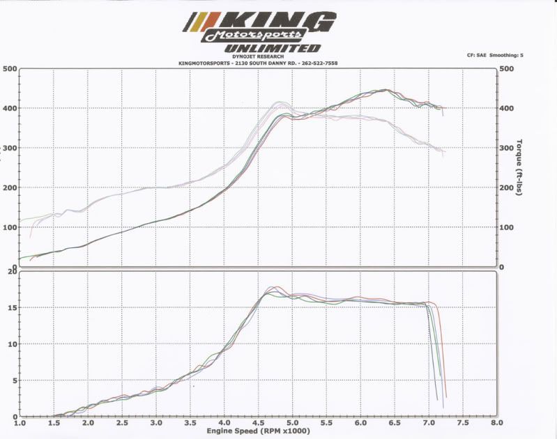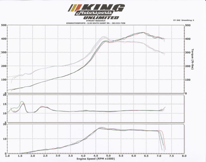 Some other notes on the Dyno setup. I noticed that they did not have the air blowing over the intercoolers, radiator only :( so I might have some heat soak issues. Their wideband was on the fritz so we used the signal from my PLX wideband from the driver's side exhaust. It worked out pretty good. We used their MAP sensor for pressure readings. I have been chasing some boost spikes for a while now. I think it boils down to the actuator preload. The higher boost I go the less boost spike I get using my Blitz boost controller (even using gain settings set to zero). Natural boost with controller bypassed is around 15psi. I believe I need to lower the bast boost to around 12psi. Overall I like the turbo kit however from searching other peoples dynos of similar turbos 2.5-4K region is a little low on torque. I was expecting about another 30-50ft-lbs in that rpm range. Base timing is set @ 15 degrees. Other interesting observations, hp drops off over 6.5Krpm, Overall peak torque I believe is a little low, was expecting about another 15-20lb-ft. Perhaps the 2.5" intercooler piping, throttle bodies, and larger inlet/outlet intercoolers are in order. Maybe that will increase torque across the board. Other than altering the tune I am at a loss on how to bump up the torque keeping the turbos I have on the vehicle. Any ideas???