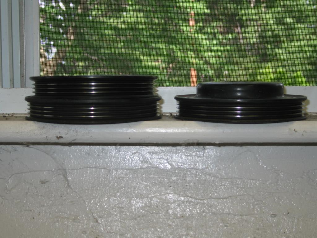 | with the naked eye. The J30 water pump pulley is offset back by a lot. stock tt & na pulleys on left J30 pulley on the right