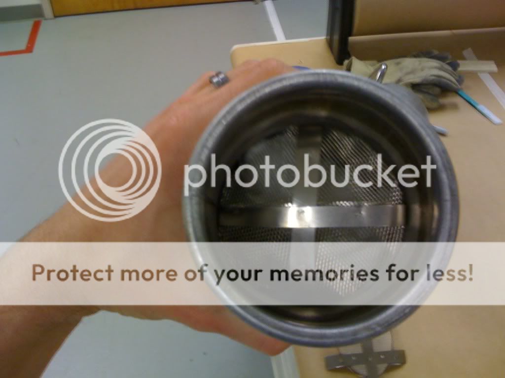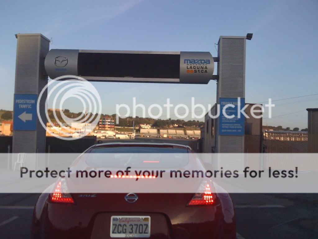 | Short video (in case you don't feel like reading and looking at pictures, I am driving at 1:50). I had been following Rob (Z Car Garage) in the shop 370 for many laps just for a fun lead/follow, then decided to try and make a move (as you'll see in the vid). The 370 has got some power! [ http://www.youtube.com/watch?v=jc27teFar8k ] It was a fantastic day at Monterey's historic Laguna Seca Raceway last Thursday with Norcal Racing (ncracing.org). Our caravan group was 10 cars strong: 6 Z33s, 1 Z34, 1 TT G35, and 1 supercharged challenger. The Z (350) was meatballed twice for breaking the sound limit of a measly 92dB. Thankfully, my exhaust is v-band clamped into sections, so I was able to remove the catback "megaphone" piece (see rocket launcher picture) and install a 3" pipe that we had ginned up at the 11th hour. I packed it with some fiberfrax (silica and alumina fibers), then spot welded a nickel screen over the end and cinched it down with titanium sheet metal. Wa-la! 89dB (and a noticeable loss of power - bah!