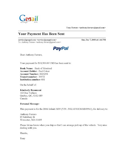 | All spelling errors by me are intentional. My buddy wanted to buy this M35 off of Craigslist. I was bored and wanted to have some fun, so I fucked with this dude/bitch for a while. Their emails are in italics, mine are in bold Hi Tony, you made the right choice! My 2006 Infiniti M35 Automatic 20k miles is in great shape, no problems, damages or hidden defects. It was never involved in any accident and non smoker car. Exterior Color: White Interior Color: Black. Perfect car! The price for this beauty is $11,900. Mileage: 19,897. Regarding payment I prefer that our deal to be supervised by Yahoo Finance. If you are really interested in test driving and inspecting the car, please reply with the following information: -Your full name, -Your shipping address. I will keep the car for you until I will have your final answer. Regards, Kimberly Beaumont 5 legit looking pictures attached... Mrs. Kimberly, OK, I'm glad you agree to the eBay program. Do you have any more information on how it works? I've never personally used it, but I have heard of people recommending it. I looked on eBay's site but it is HUGE and tough to sort thru. Just want to get some more information before I send $12K to some unknown account. We could also use a third party escrow company if that works for you. If the car is in Canada, and I'm in Massachusetts USA, what kind of customs paperwork would I have to fill out? Are there other duties and tariffs associated with the sale or transport? I know I've shipped small packages to Montreal before, and it's been a pain. I just want to make sure my car isn't held up at the border for 3 weeks :-/ This car is an AMAZING deal, almost too good to be true. I have got some great deals on cars in the past, well below blue book, so I understand you could simply want a quick sale. I am curious as to why you're asking about $9k less than blue book. Is this a part of the divorce filings? If it's personal, I don't need to know, but I would like some kind of reasoning behind the low price. Not that I want to pay more, LOL!! Can I get the VIN number so I can run a CarFax? This car doesn't have a salvage title does it? I would need to run a CarFax prior to sending funds anyway. Are you the first owner of the car or did you buy it used? Oh man, I am so excited right now, the more I look at the pictures, the more excited I get. I think I'm falling in love with this car!!! Hope to hear from you soon, Mr. T About eBay , they will contact you today to explain you the entire procedure. The car is US model and it is still registered in US. You have to pay only 11,900 there are no other hidden costs. Shipping will be done whit lufthansa cargo I have a friend there who will manage me a low price shipping and I assumed that it is my duty to pay for shipping it. It will be delivered directly to your address. The only thing because I am selling it for a low price, because I divorced and after the divorce I own this car, I don`t need it and I need money asap because this is a tough time for me. VIN : jnkay01e36m109561 Thanks. I have not heard from eBay as of yet. I actually just checked out some flights from Boston to Quebec airport (YQB) and I can get a round trip ticket (in case the deal doesn't work out) for $600 or so. When would be best for your schedule for me to visit? Do you have a representative there I could meet with to test drive the car. I have family in Montreal actually so it'd be a great opportunity for me to visit with them too :-) I think this would be best for both parties, as I could give you a cashiers check in person, and I could see the car prior to puchase. Hopefully you agree and we can get the ball rolling here. Thanks, Tony Tony, Did you check your junk folder? Maybe because of an error the Purchase Invoice for payment they sent you might get to that folder. Please get back to me asap. Kimbo, You're right, that's where it went. I've replied to them and the process should be moving along now. Thanks, Tony two days later... Kimberly, Have you heard back from eBay yet? I've wired the monies as they instructed so you should have received confirmation by now. I'm a little concerned that I have not received a confirmation yet. Thanks, Tony Tony, I am sorry but I didn´t received yet the payment confirmation from eBay. They told me that you didn´t sent the payment details yet. Please get back to me asap.