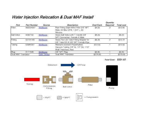 So I'd tap the OEM washer tank in the back, probably use a bulkhead fitting in the bottom of the tank. I'm going to drill a hole in the wheel well, or just in front of it to run the polyethylene tubing down along the OEM HICAS line location. Snake it up and around somehow to the front of the car, where my water injection pump lies. I'll have all the stuff shown above before the pump to prime/protect it. My pump is probably different than yours, as I have the SMC kit, and you have the Snow Performance unit. Nope, I'm wrong, we both have the same kit, just checked. Does yours look like this?: