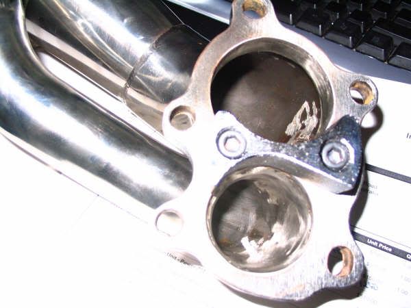 As mentioned before; main difference is the flange not being as thick (not thin by any means), the 5 bolt flange not welded all the way through, O2 sensor cap not included and 1 extra weld on the body. The 5 bolt alignment. Note the irregular size holes and clearance to the edge.