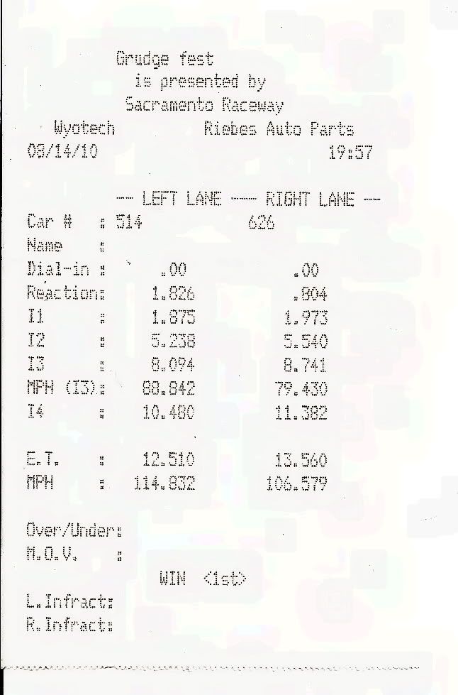| I ran a 12.510 quarter mile last night at Sacramento Raceway. My previous best was 13.7 The changes I made since my previous best: -26x10.5x16 ET streets (previously BFG g-force sport) -WOT box launch control -Nismo 740's, 300degree fuel rail and specialty z eeprom I also swapped out my powertrix coilovers the morning of with a set of NA OEM springs coupled with KYB GR2 shocks. Yay, they fit!