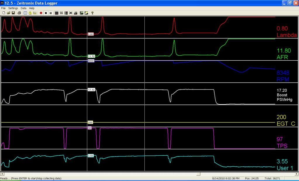 My launch control allows full throttle shifting but I decided to not use it this time since I had enough things to get used to. I put 6 gallons of 100 octane gas in my empty tank on the way there and slowly raised boost all night while logging my air fuel ratio to be safe. Around 17psi I found that first through third gear were ok but in fourth I hit as high as 12.4 Here's a in car video of my run. My reaction time is way off and you will see why. However, I still managed to overtake the mustang that easily had three car lengths on me. |