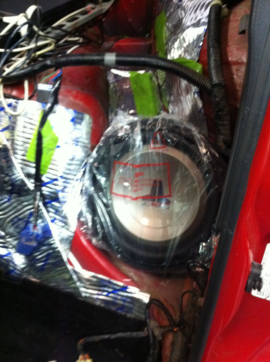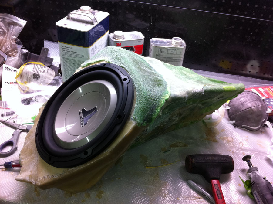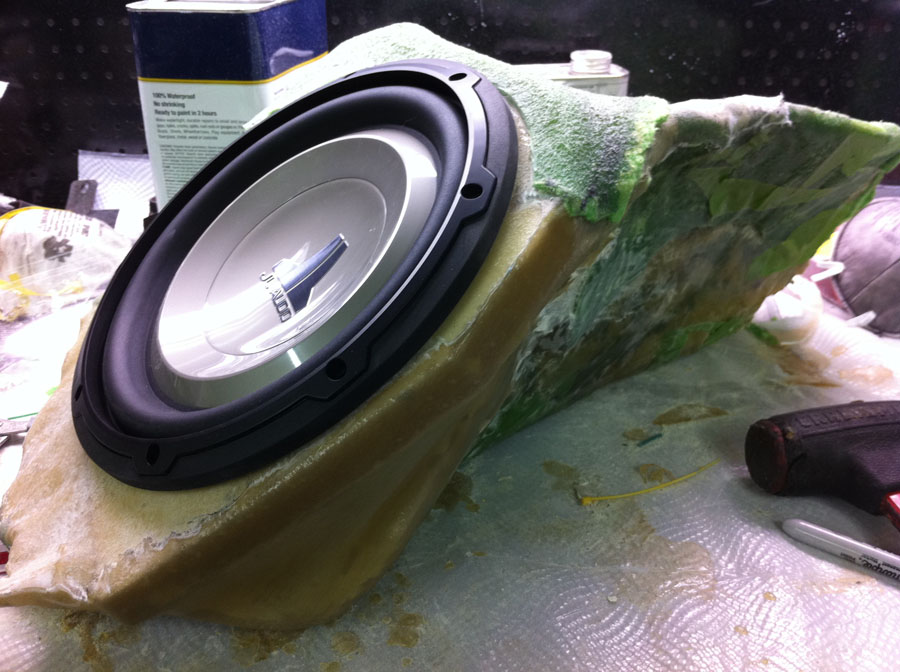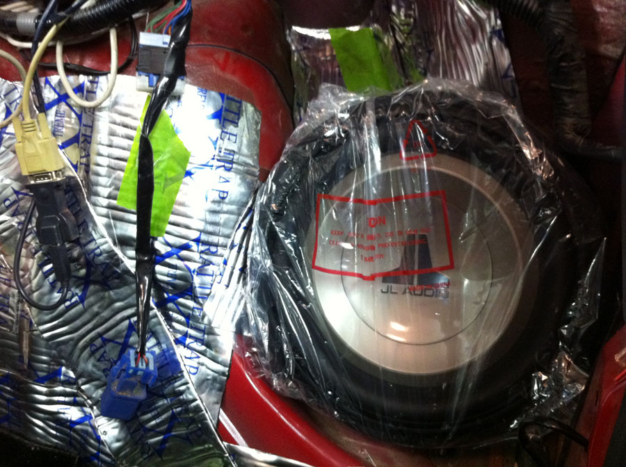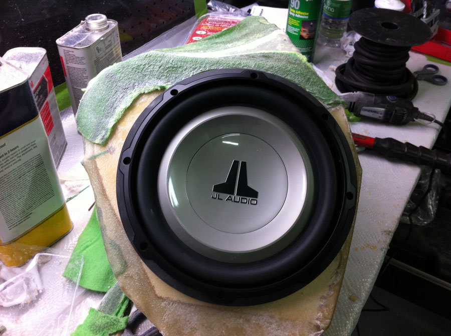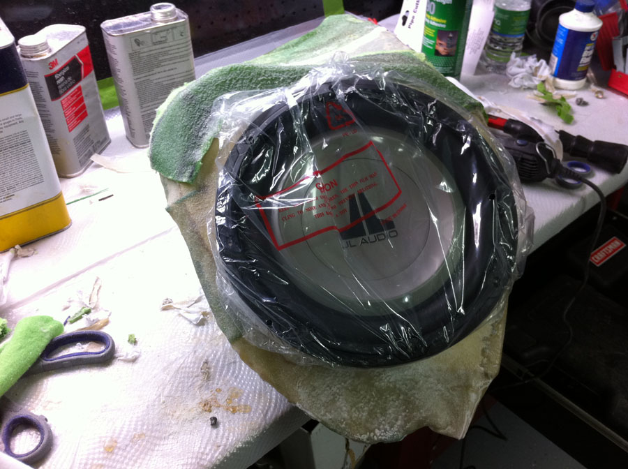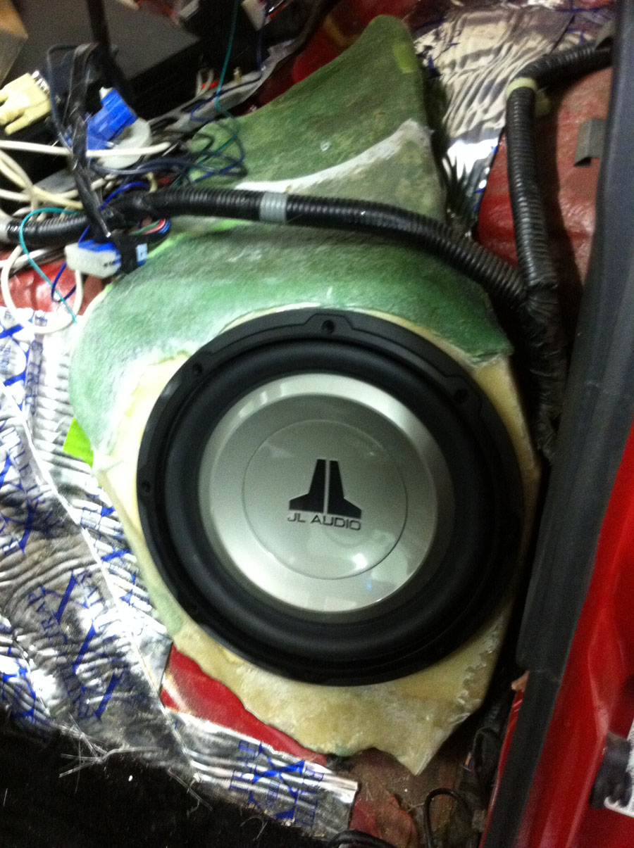 | Since most of my interior is out for sound deadening and I have already sunk a small fortune into my car I figured it was as good of time as any to upgrade the stereo system (thanks to all the members who helped with my selection of components). I have never really liked any of the options for mounting sub’s in the Z. I have a set of Chris’s speaker box’s and they are very well made but still take up a lot of trunk space and are visible, which for whatever reason I don’t like. I started looking around for places to stash an 8 or 10 inch sub and decided to got with a spot behind the driver seat where the fuel pump controller is located. I bought a JL Audio 10w1v2-4 (shallow mount). It only requires .6 cubic feet to operate and had a mount depth of 4 inches and change. Once the speaker arrived I did a quick test fit and then covered the entire channel going back toward the trunk with painters tape and made a fiberglass mold of the bottom.
