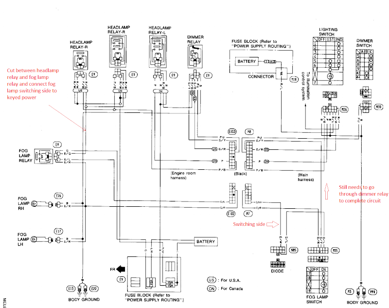 | time running lights on their Z and have the el schematic for their car's year? I am talking about the original Zippin one that has you cut and reroute the switching supply side of the fog light relay to a keyed power source. This allows the fog lights to come on automatically even with the lights off (incl the parking lights). Can you please compare what you have to what is shown in my schematic below to see if there is any difference. If there is no difference I do not see how this works without the parking lights at least being on. I did this for my 93 Z and it worked and for my 95 and it worked until recently. The most important thing for me really is to understand how the circuit is working. I simply do not understand how the fog lights can be on (based on the information in the schematic) without the parking or headlamps on.