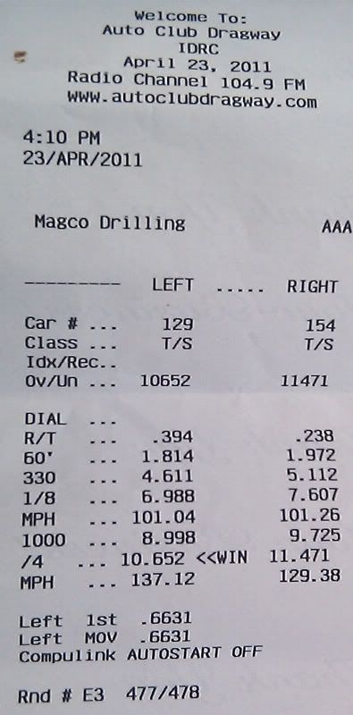 Today marks another well-deserved victory for Dean, his second at the IDRC. Not only was he the top qualifier, but he managed to win True Street while getting himself blacklisted from AAA Dragway, all at the same time! Anything over 135mph requires a full race cage, which is out of the question for Dean since he daily drives it. So with a past run of 142mph(!) and various warnings, they were ready to pounce when this happened in qualifying today... 135.09...oops.