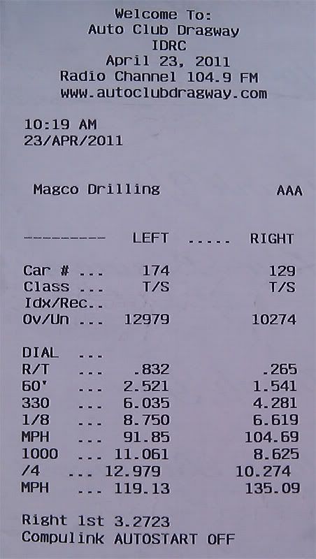 Today marks another well-deserved victory for Dean, his second at the IDRC. Not only was he the top qualifier, but he managed to win True Street while getting himself blacklisted from AAA Dragway, all at the same time! Anything over 135mph requires a full race cage, which is out of the question for Dean since he daily drives it. So with a past run of 142mph(!) and various warnings, they were ready to pounce when this happened in qualifying today... 135.09...oops.