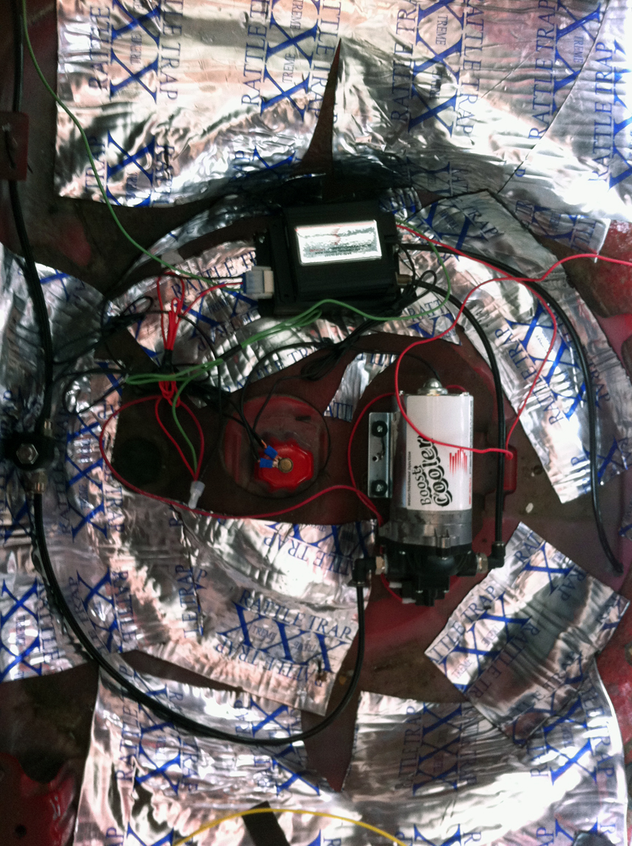 Sound deadening and all of my water injection components mounted in the trunk and fed from my windshield washer reservoir.