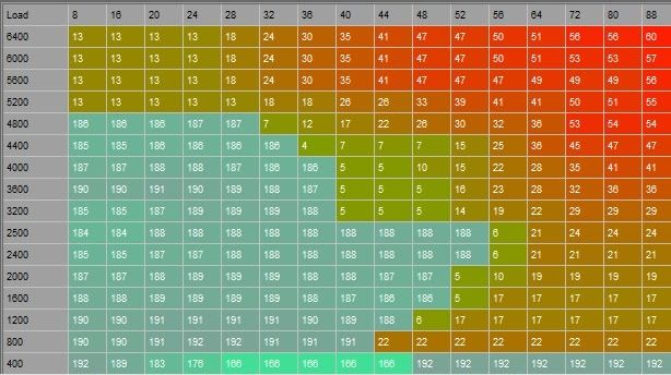 | I don't think I totally understand your question, so I apologize in advance if I'm just rambling about crap you already know, but I figure this might be useful for others reading, too. The seemingly arbitrarily "high numbers" and "low numbers" are used to differentiate between open loop and closed loop. In the fuel map this is obvious, I'm not totally certain how this is used on the timing map (but I believe it has to do with input from the knock sensor). For example, take a look at this view of the fuel map.