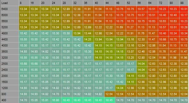 All of the teal-highlighted cells are cells which are accessed in closed loop (O2 sensor feedback as you know). Everything else is open-loop and ignores the O2 sensors. These are target air-fuel ratios filtered to make sense to us. But if we look at the raw values, the map looks a bit different, this is what I believe you were referring to (though using a timing map in your example; the fuel map view makes a bit more sense to me since I'm unclear on the closed/open loop distinction in timing maps).