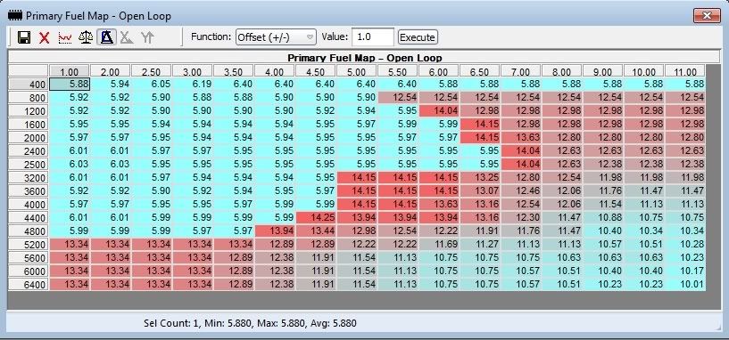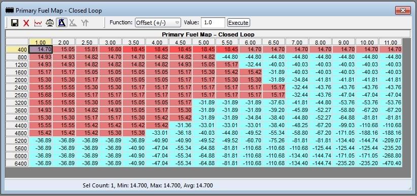 Now the cells over 128 are calculated correctly and make sense, but the rest don't. Both of these views are showing the same map, they're just plugging the information through different formulas to filter them. It's kind of obnoxious because you can't view the map with one display, but it works. So, when you see tuners change the values above/below this 128 threshold, it's simply the way to change the cell between being an open loop or closed loop cell. The difference in high numbers (above 128) and low (below 128) is just there, as far as I know, so the ECU knows which cells get O2 sensor feedback and which don't.