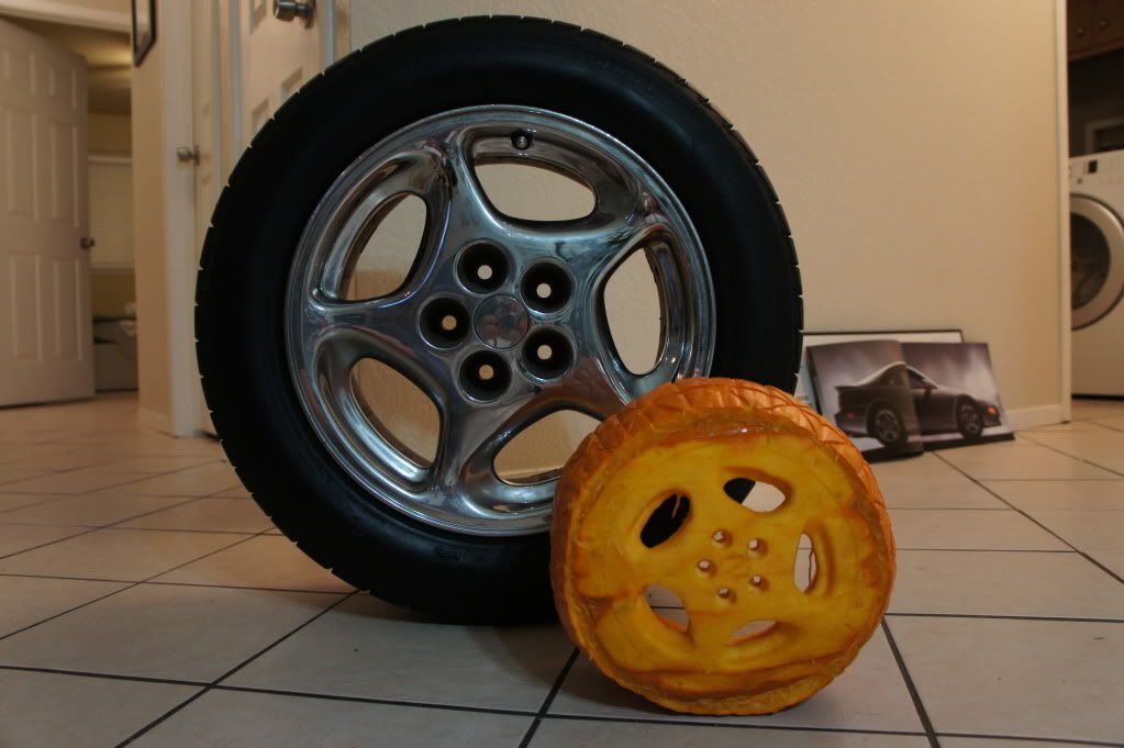 My wonderful wife made the tread on the tires. We tried to mimic what I think was the tread pattern on the original tires...atleast that's what we found in a z brochure I had. I really wanted to make the face of the wheel concave like the TT wheels but my pumpkin was not thick enough.