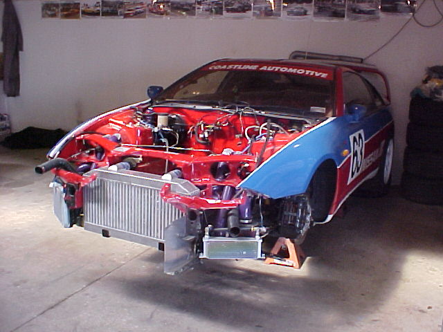 GT1 Race car - oil cooler front left behind spoiler and the remote oil filter top left of engine bay (why this is so high up and such a small filter, I don't know - was done before I bought the car. When the dry sump is fitted it will be mounted near the front of the car, like the classic race car.