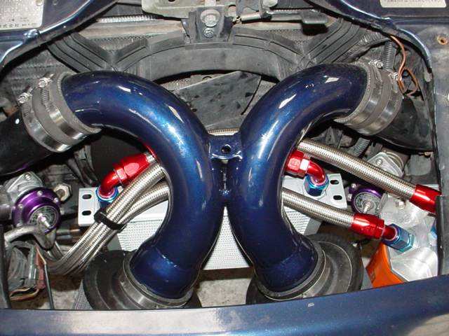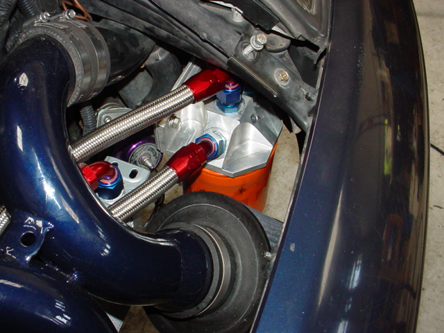 | Pump mounting - you realise the pump is mounted direct to the sump right? The pulley and pump directly fit where the air con goes. I really doubt a bracket will work there is just no space. Now if you wanted to replace the power steering pump you might be able to stick the aircond there or the dry sump pump there. Maybe an aftermarket air conditioning unit or a cool suit would be easier. Putting a dry sump system in a street car is really not a realistic proposition, where do you stick the oil tank, where do you run the oil hoses. You need at least a 2 gallon oil tank - that won't fit in the engine bay. There will probably be a requirment to prime the pump which makes a street vehicle not that realistic. I have the system at home but intend to get a dummy block mocked up shortly. Will post more pictures as we go through the process, the other engine is now in the car with a standard sump so can't take any more photos of that. Will post some dyno results soon when we get the cam timing sorted. Regarding the oil cooler/oil filters - all three cars run remote oil filters and remote oil coolers. Below are some pics of the three different setups Oil coolers - Most have 25 row oil coolers with dash 10 braided hoses All oil filters except one are HP6 oil filters - the rest of the stuff I don't know the mechanics just did it using standard race car stuff. You might be able to tell from the pics. Street Car - both oil cooler and oil filter in front underneath the intakes behind radiator