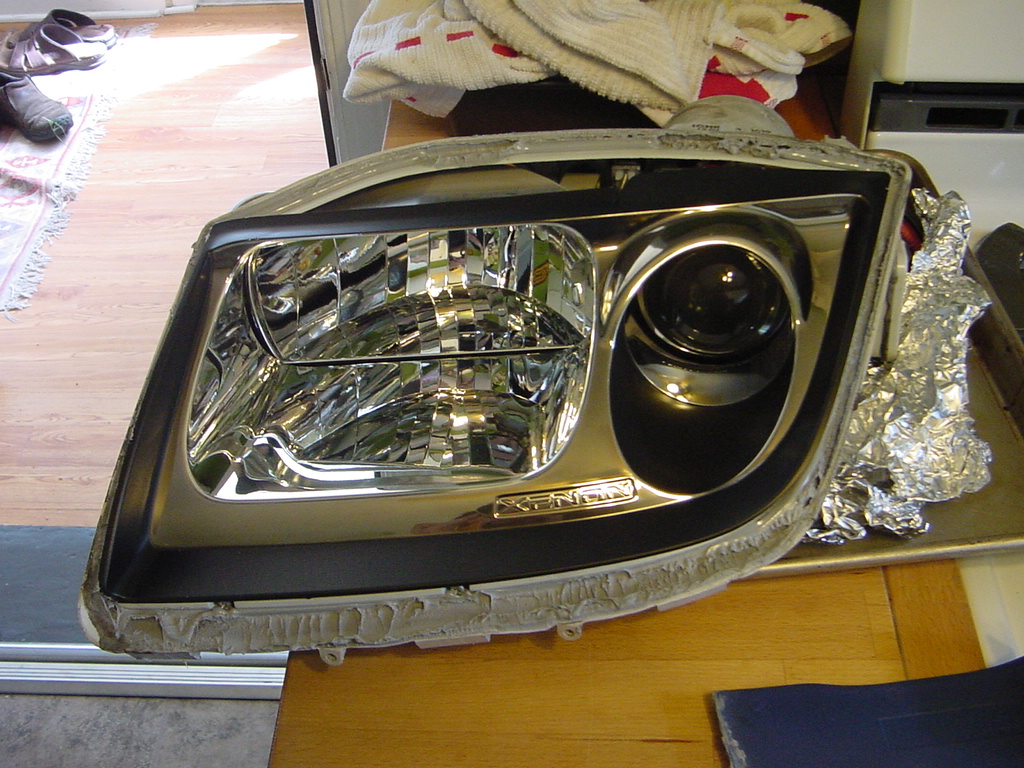 Well that was the easy part... The headlights are internally aimed for RHD use, the cut off shield in front of the bulb dictates the shape and cut off of the beam pattern. The only way to get access to the shield is to open up the head lights and take apart the projectors. Years back olyar15 did a AutoFAQ on this: [ http://www.twinturbo.net/nissan/300zx/forums/technical/view/881894/Modifying-the-99-Jspec-HID-for-LHD.html ] I am reusing a few of his old pictures below to supplement ones I took. I opted for a much cooler oven temp in order to try and avoid any warping or heat related problems. I did a test run on a broken stock head light that I had been saving for just this reason. That went well so I decided to proceed. Removed all the possible bits from the outside of the headlights, including the gaskets, mounting brackets, bulbs and ballasts. The igniters on the side of the head lights are sealed/glued in place so I wrapped them in foil to deflect some heat. Oven 200 degrees, 20 min. - check wife not home to see you turn her kitchen into a work space - check shot of Jack to calm the nerves - check Here goes nothing: