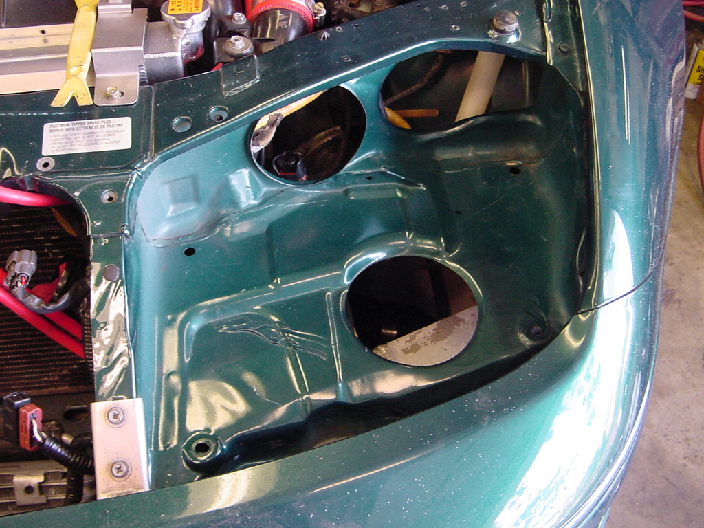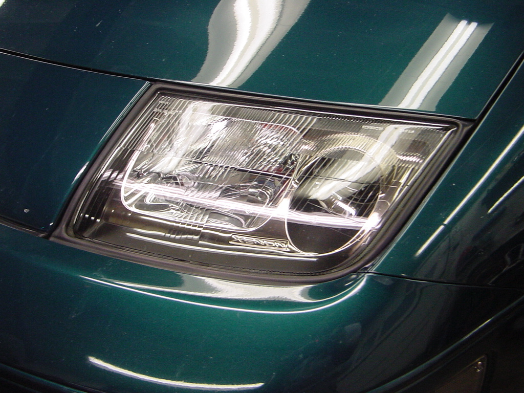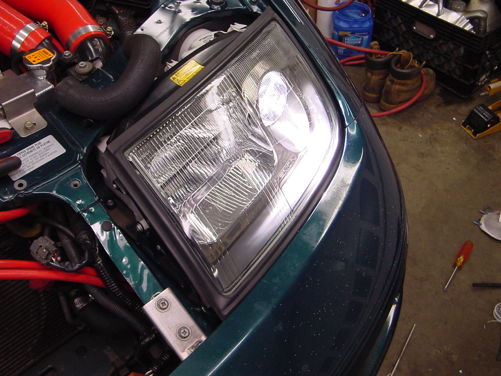 Since I had most of the bits under the nose panel pulled out of the way... this presented a dilemma. I've had a set of JDM Xenon head lights packed away for some time and this would be the easiest time to access all the mounting bolts with out having to remove the fascia. Irony: [ http://www.yugobernie.com/techs/Headlight_Removal/ ] A few min later things looked like this: