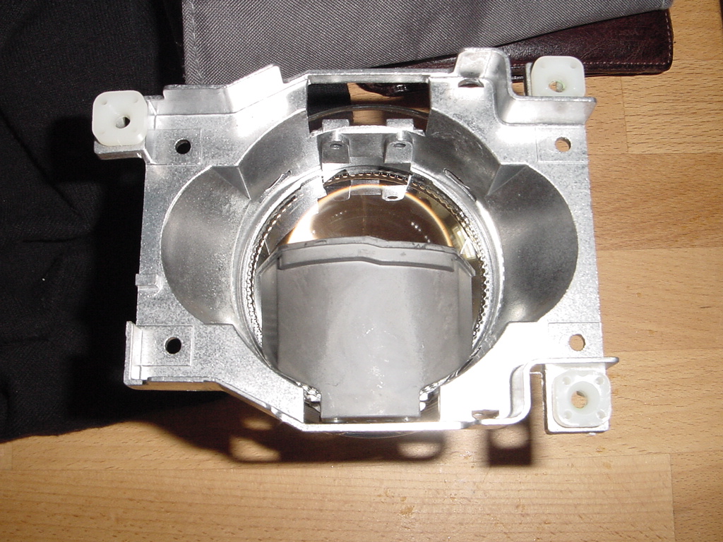 The projector housing assembly is held in and aimed by the 3 screws circled, I turned each one a little bit at a time until all 3 backed out of the projector assembly.